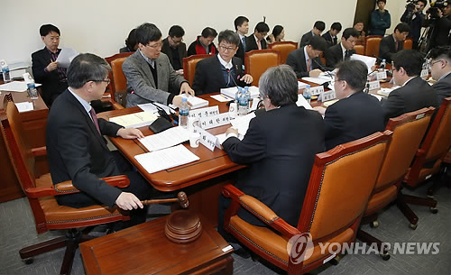 | △ 23일 오전 국회에서 열린 공무원연금특위 대타협기구 재정추계분과회의에서 김용하 위원장이 의사봉을 두드리고 있다. |