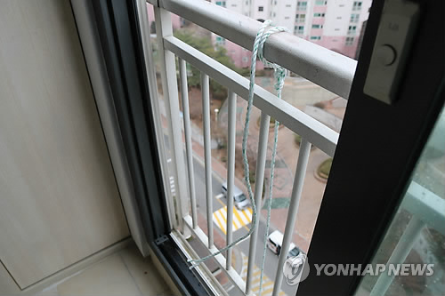| △ 아파트 난간에 묶인 빨랫줄 (서울=연합뉴스) 황철환 기자 = 수도권 일대를 활보하며 빈집을 털어온 요리사 출신 30대 남성이 아파트 14층에서 줄을 타고 내려오다 떨어져 크게 다쳤다. 사진은 당시 피의자가 이용한 빨랫줄. 2015.3.25 << 서울 서초경찰서 제공 >> hwangch@yna.co.kr |