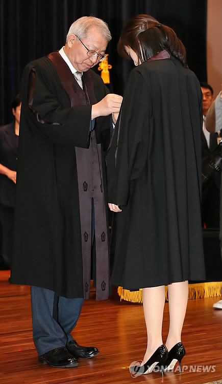 | △ 법복 입혀주는 양승태 대법원장 (서울=연합뉴스) 박지호 기자 = 1일 오전 서울 서초동 대법원에서 열린 신임 법관 임명식에서 양승태 대법원장이 신임 법관 대표에게 법복을 입혀주고 있다. 2015.4.1 jihopark@yna.co.kr |