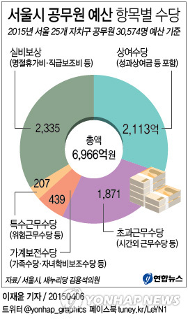 서울시의회 김용석(새누리당) 의원이 서울시로부터 받은 올해 자치구 공무원 수당 예산 내역을 보면 총 액수는 6천966억원에 달한다.