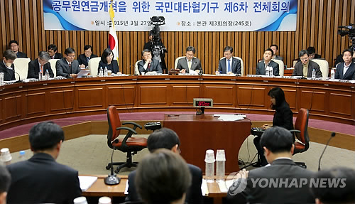 | △ 지난달 27일 국회에서 열린 공무원연금개혁을 위한 국민대타협기구 마지막 전체회의에서 참석자들이 토론을 벌이고 있다. |