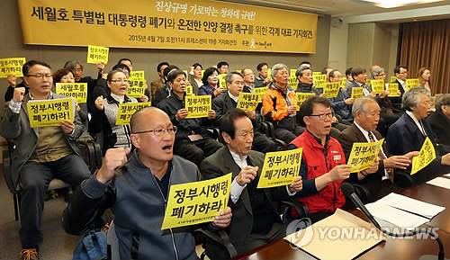 (서울=연합뉴스) 권영전 기자 = 세월호 유가족과 관련 시민단체는 해양수산부가 입법예고한 세월호특별법 시행령안이 '위헌위법'이므로 폐기해야 한다고 주장했다.