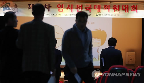 | △ 공노총 임시 대의원대회 (대전=연합뉴스) 양영석 기자 = 대한민국공무원노동조합총연맹(공노총) 대의원들이 8일 정부 대전청사에서 열린 임시 대의원대회에 참석하고 있다. |