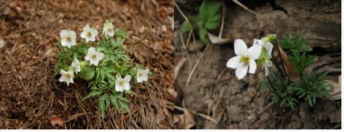 남산제비꽃은 국내 전역에 분포하는 대표적인 봄꽃으로, 흰색 꽃이 피며 잎이 여러 개로 갈라져 있어 다른 제비꽃류와 쉽게 구별할 수 있다.