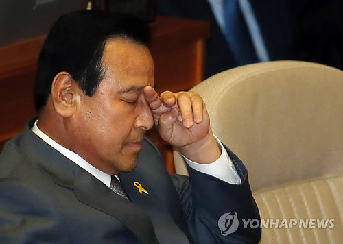 | △ 성완종 전 경남기업 회장으로부터의 금품수수 의혹을 받는 이완구 국무총리가 14일 국회 본회의장에서 진행된 대정부질문 동안 곤혹스러운 표정을 짓고 있다. |