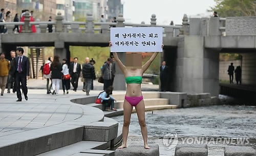 | △ 20대 여성 도심서 비키니 차림 1인 시위 (서울=연합뉴스) 페미니스트와 동물보호운동가를 표방하는 이모씨가 15일 낮 서울 무교동 청계천에서 '왜 남자 꼭지는 되고 여자 꼭지는 안 되냐'는 내용의 피켓을 들고 시위를 벌여 주변의 이목을 끌었다. 이씨는 앞서 13일과 14일에도 광화문광장과 강남역에서 '모피를 입느니 차라리 죽겠다'고 적힌 피켓을 들고 반라시위를 벌였다. 2015.4.16 << 인스타그램 @sophialee8888 제공 >> |