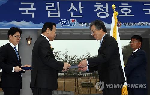 | △ 이완구 국무총리가 2일 오후 경남 산청군 국립산청호국원에서 열린 준공식에서 성우종 도원이앤씨 대표에게 대통령 표창을 수여하고 있다. 2015.4.2 |