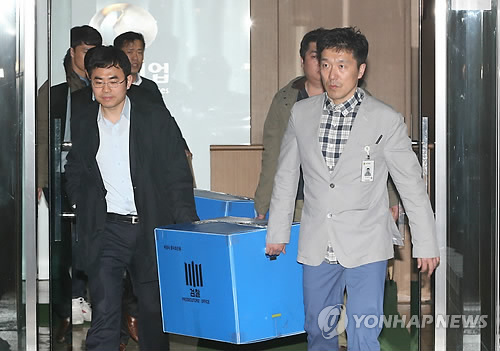 | △ 성완종 전 경남기업 회장의 정치권 금품제공 의혹을 수사 중인 검찰 특별수사팀 관계자들이 지난 15일 저녁 서울 동대문구 답십리동 경남기업 본사에서 압수수색을 마친 뒤 압수물이 든 상자를 옮기고 있다. |