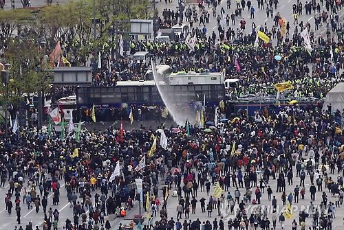 | △ 시위대 향해 물대포 (서울=연합뉴스) 박동주 기자 = '세월호 1주년' 이후 첫 주말을 맞은 18일 오후 '세월호참사 범국민대회' 참가자들이 광화문 광장 북쪽으로 이동하려 하자 경찰이 물대포를 쏘고 있다. 2015.4.18 pdj6635@yna.co.kr |