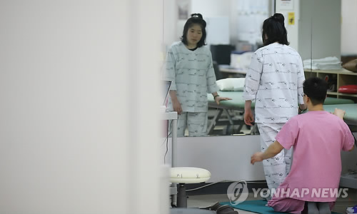 | △ 재활에 전념하는 김효정 양 (서울=연합뉴스) 김도훈 기자 = 지난해 2월 체코에서 교통사고를 당한 김효정 양이 16일 오후 서울 강남구 강남세브란스 재활치료실에서 보행훈련을 하고 있다. 당시 사고로 머리와 골반, 갈비뼈 등을 다쳐 중상을 입은 김양은 연합뉴스의 보도 이후 대한항공 등 각계의 도움으로 입국해 수술을 받고 재활훈련을 하고 있다. 2015.4.19 superdoo82@yna.co.kr |