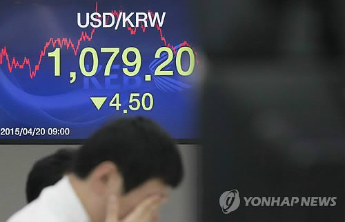 | △ 원·달러 환율 1079.2원으로 하락 마감 (서울=연합뉴스) 윤동진 기자 = 20일 서울 외환시장에서 원·달러 환율 종가가 달러당 1,079.2원으로 전일보다 4.5원 내린 가운데 이날 오후 서울 중구 외환은행 딜링룸에서 직원들이 업무를 보고 있다. 이날 기록한 원·달러 환율은 1월19일 1,078.0원 이후 최저치다. |
