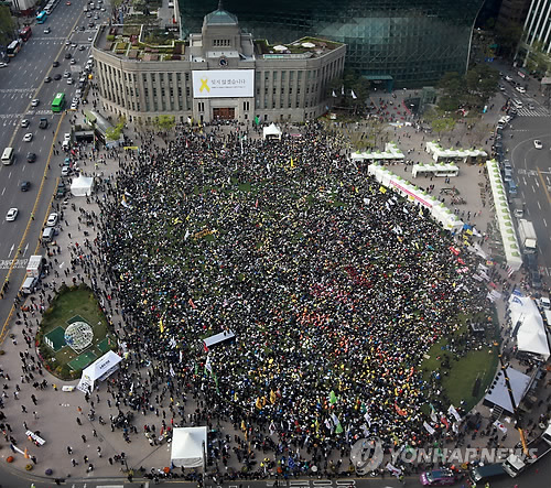 | △ 서울광장서 열린 세월호참사 범국민대회 (서울=연합뉴스) 박동주 기자 = 18일 오후 시청 앞 서울광장이 '세월호참사 범국민대회' 참석자들로 가득하다. 2015.4.18 pdj6635@yna.co.kr |