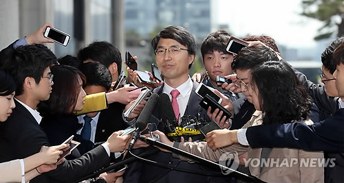 | △ 질문세례 (서울=연합뉴스) 신준희 기자 = 故 성완종 전 경남그룹 회장의 최측근으로 알려진 박준호 전 상무가 21일 오후 참고인 조사를 위해 서초동 고등검찰청으로 들어가던 중 취재진의 질문을 받고 있다. 2015.4.21 hama@yna.co.kr |