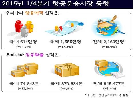 ◇국제선 1분기 이용객 역대 최고 = 국제선 1분기 여객은 엔저와 유가 하락으로 내국인의 해외여행이 증가하는 동시에 중국·동남아 여행객의 한국 방문이 증가하면서 지난해 같은 기간보다 17.3% 증가한 1천555만명으로 1분기 역대 최고 실적을 기록했다.