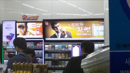 언뜻 담배 판촉장처럼 보이는 이 같은 풍경은 편의점 안뿐만 아니라 밖에서도 유리창을 통해 보이는 모습이다. 유리창이 넓은 편의점의 특성상 화려한 담배 판촉물은 편의점 밖의 사람들에게까지 어렵지 않게 유혹의 손길을 뻗친다.