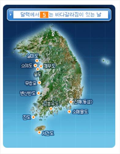 내달 5일 서해안에서는 오전 7시께 서산 웅도, 8시 화성 제부도, 9시 인천 실미도·소야도, 10시 보령 무창포에서 잇따라 바다갈라짐 현상이 시작한다.