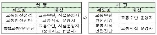 국토부는 교통안전점검·교통안전진단·특별교통안전진단 등 3개로 나뉜 제도가 복잡하다고 보고, 운수회사에 대해서는 교통수단 안전점검, 터미널 등 교통시설 운영자에 대해서는 교통시설 안전진단으로 이원화하기로 했다.