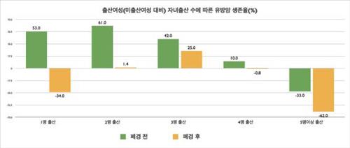 이와 달리 폐경 후 유방암으로 진단받은 여성의 경우는 2명과 3명의 자녀를 뒀을 때만 생존율이 각각 1.4%, 25% 높았다. 자녀가 1명, 4명, 5명 이상인 여성은 생존율이 각각 34%, 0.8%, 62%가 줄었다.