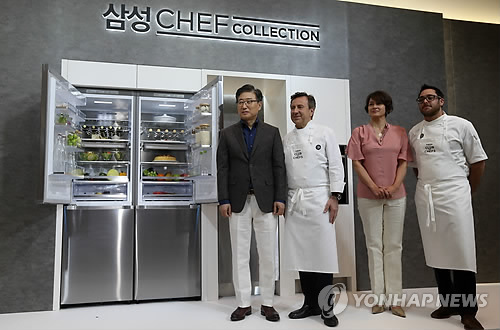 | △ 2015 삼성 셰프컬렉션 미디어데이 (서울=연합뉴스) 신준희 기자 = 삼성전자 윤부근 사장(맨 왼쪽)과 방송인 박칼린씨, 셰프들이 7일 오전 서울 중구 신라호텔에서 열린 '2015 삼성 셰프컬렉션 미디어데이' 행사에서 제품 라인업을 소개하고 있다. 2015.5.7 hama@yna.co.kr |