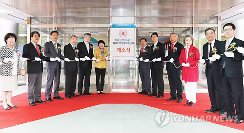 | △ (서울=연합뉴스) 8일 강원도 원주첨단의료기기 테크노타워에서 열린 '원주 기업성장지원센터 개소식'에서 황규연 산업통상자원부 산업기반실장 등 참석자들이 현판 제막을 하고 있다. 2015.5.8 << 산업통상자원부 제공 >> photo@yna.co.kr |