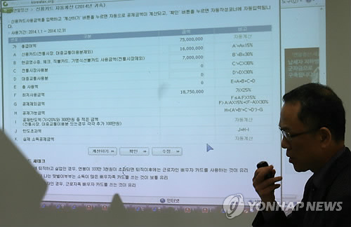 | △ 김선택 한국납세자연맹 회장이 지난 1월 서울 종로구 신문로 한국납세자연맹에서 연말정산 자동계산기 시연을 하고 있다. (연합뉴스 자료사진) |