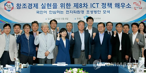 | △ '창조경제 실현을 위한 제8차 ICT정책 해우소' (서울=연합뉴스) 지난 8일 저녁 서울 서초구 한국정보통신진흥협회(KAIT)에서 '국민이 안심하는 전자파환경 조성방안 모색' 을 주제로 열린 '창조경제 실현을 위한 제8차 ICT정책 해우소' 토론회에서 최재유 미래창조과학부 제2차관 등 참석자들이 기념촬영하고 있다. << 미래창조과학부 제공 >> |