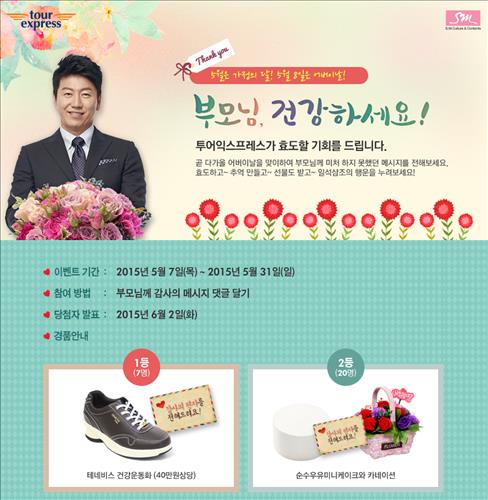 (서울=연합뉴스) 전준상 기자 = SM C&C투어익스프레스는 가정의 달인 5월을 맞아 31일까지 효도이벤트를 진행한다고 12일 밝혔다.