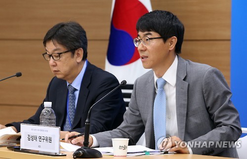 | △ 2015 상반기 KDI 경제전망 브리핑 (세종=연합뉴스) 배재만 기자 = 한국개발연구원(KDI) 김성태 연구위원이 20일 오전 정부세종청사 기획재정부 공용브리핑룸에서 2015 상반기 KDI 경제전망에 대해 브리핑하고 있다. 왼쪽은 조동철 수석이코노미스트 겸 거시경제연구부장. |