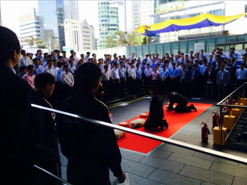 이어 삼성전자[005930] 딜라이트홀 앞 광장과 삼성물산[000830], 삼성생명[032830] 사옥 앞에 모여 삼성 3119구조단으로부터 재난 시 행동요령 등에 대해 배웠다.