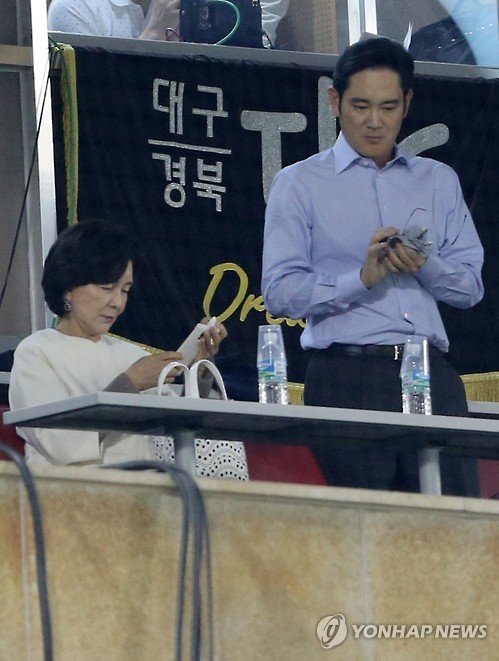 | △ 잠실야구장 찾은 이재용 부회장, 홍라희 관장 (서울=연합뉴스) 윤동진 기자 = 이재용 삼성전자 부회장(오른쪽)과 홍라희 리움미술관 관장이 21일 오후 서울 송파구 잠실야구장에서 열린 2015프로야구 삼성 대 두산의 경기를 관전하고 있다. 2015.5.21 mon@yna.co.kr |