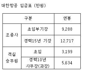 대한항공 경력 15년 기장의 연봉은 1억2천여만원, 경력 10년 승무원 연봉은 5천634만원이며 연장, 야간, 휴일 수당 등이 추가된다.