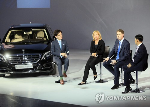| △ 벤츠 인텔리전트 드라이브 기술 소개 기자회견 (고양=연합뉴스) 김승두 기자 = 메르세데스-벤츠 코리아가 26일 일산 킨텍스에서 플래그십 모델 S 클래스를 통해 혁신적인 인텔리전트 드라이브(Intelligent Drive) 기술을 소개하는 워크숍을 개최했다. 다임러 AG 이사회 멤버이자 메르세데스-벤츠 카 그룹의 마케팅·세일즈 총괄인 올라 칼레니우스(우에서 2번째)가 직접 프레젠테이션을 진행하며 기자들의 질문에 답하고 있다. 2015.5.26 kimsdoo@yna.co.kr |