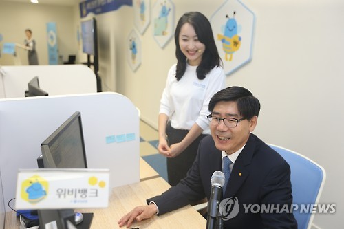 | △ 우리은행, 국내 첫 인터넷전문은행 시범모델 '위비뱅크' 출범 (서울=연합뉴스) 우리은행은 인터넷 전문은행의 운영경험을 쌓고 수익모델을 검증하기 위해 시범 모델로 모바일 전문은행인 '위비뱅크(WiBee Bank)'를 출범시켰다고 26일 밝혔다. 이광구 우리은행장이 이날 열린 '위비뱅크 출범식'에서 대출고객과 상담을 하고 있다. (우리은행 제공) |