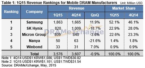 삼성전자의 모바일 D램 매출액은 올해 1분기 18억6천300만 달러로 작년 4분기(16억6천500만 달러)보다 11.9% 증가했다. 삼성은 점유율을 4분기(46.1%)보다 6.0%포인트나 끌어올렸다.