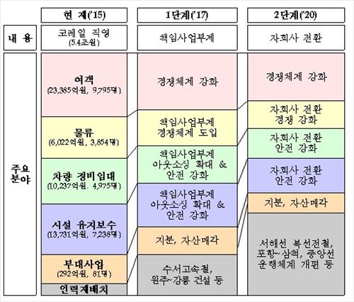 코레일은 먼저 여객을 제외한 물류, 차량정비·임대, 유지보수 등 3개 부문의 회계를 분리해 올해 안에 책임사업부제를 도입하고 2017년부터 자회사 전환을 추진한다.