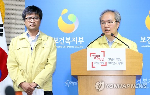 | △ 보건복지부, '메르스 추가 환자 2명 발생' (세종=연합뉴스) 배재만 기자 = 권준욱 보건복지부 공공보건정책관이 29일 오전 정부세종청사 보건복지부 공용브리핑룸에서 메르스 일일상황점검회의 결과를 브리핑하며 금일 오전 7시 현재 2명의 신규 환자를 확인했다고 밝히고 있다. 현재까지 총 환자 수는 9명이다. 왼쪽은 김영택 질병관리본부 감염병관리과장. |
