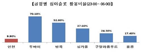 현재 심야슬롯(Slot·시간당 가능한 비행기 이착륙 횟수) 활용률을 보면 두바이공항은 70.1%이지만, 인천공항은 9.9%에 불과하다.
