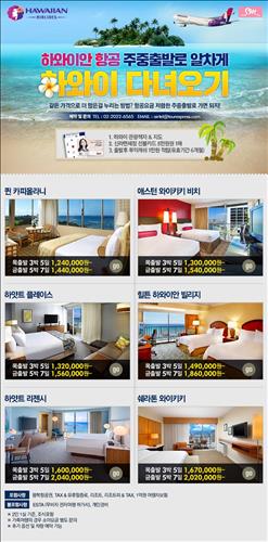 (서울=연합뉴스) 전준상 기자 = SM C&C투어익스프레스는 주중에 출발하는 하와이안 항공 하와이 개별 맞춤형 상품을 판매한다고 1일 밝혔다.