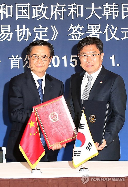 우리나라의 최대 교역국이자 투자 대상국인 중국과의 FTA는 2005년 민간 공동연구로 시작된 이래 2014년 11월 실질 타결 선언, 2015년 2월 25일 가서명을 거쳐 이날 정식 서명이 마무리됐다. 앞으로 국회 비준동의 등 발효 절차만 남겨놓게 됐다.