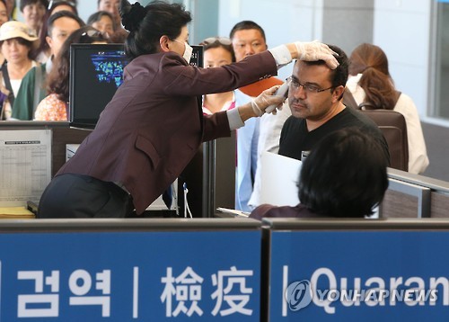 | △ 체온 측정 받는 중동발 입국객 (서울=연합뉴스) 김주성 기자 = 메르스(중동호흡기증후군) 감염에 대한 불안감이 커지자 1일 오후 중동발 여객기를 타고 인천공항에 도착한 한 외국인이 발열 감시 적외선 카메라에 열이 감지되자 정밀 체온측정을 받고 있다. 2015.6.1 utzza@yna.co.kr |