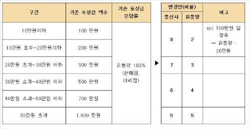 지금까지는 신고포상금 전부를 유통망에서 부담해야 했으나 앞으로는 신고포상금 100만∼200만원 구간에서는 이동통신사와 유통망이 각각 8대2의 비율로, 포상금 300만원의 경우 각각 7대3의 비율로 분담한다. 포상금 300만∼500만원 구간에서는 각각 6대4, 포상금 1천만원일 때에는 5대5로 나눠 낸다.