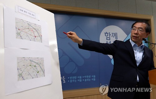 | △ 서울시장, 메르스 관련 긴급 브리핑 (서울=연합뉴스) 신준희 기자 = 박원순 서울시장이 4일 오후 시청 브리핑룸에서 메르스 관련 긴급 브리핑을 하고 있다. 왼쪽 지도는 해당 환자의 이동 동선. |