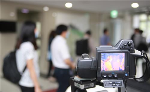 | △ 가스안전공사 직원들이 마스크를 착용하고 충북혁신도시 본사 1층 출입구에 설치된 열화상 감지카메라를 지나가고 있다. |