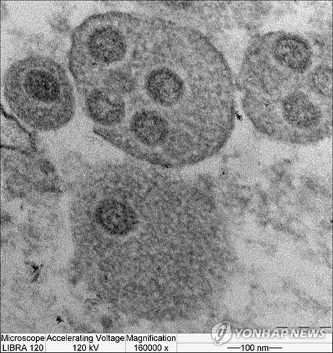 | △ 국립보건연구원에서 전자현미경으로 촬영한 세포 내 메르스 바이러스(16만 배율) |