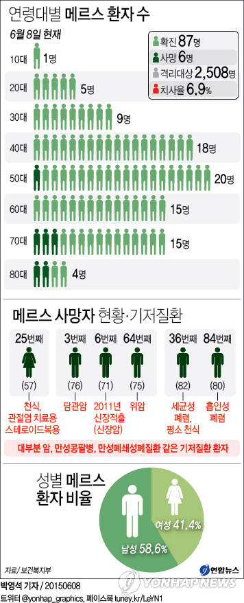 (서울=연합뉴스) 하채림 기자 = 국내에서 8일 현재 확인된 중동호흡기증후군(메르스) 사망자는 6명으로 지금까지 치명률이 7% 수준이다.