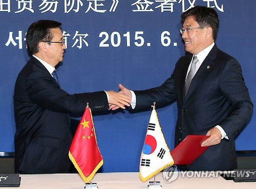 | △ 지난 1일 오후 서울 용산구 소월로 그랜드하얏트 호텔에서 열린 '한-중 자유무역협정(FTA) 서명식'에서 윤상직 산업통상자원부 장관(오른쪽)과 가오후청 중국 상무부장이 서명을 한 뒤 악수하고 있다. |