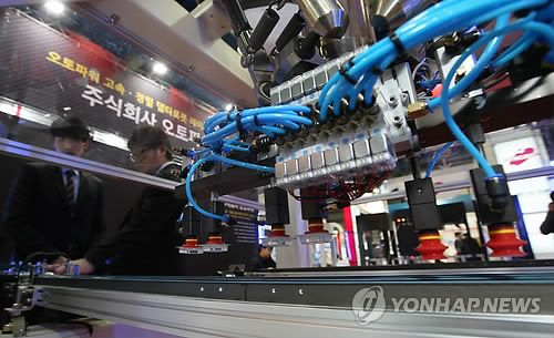 | △ 지난 3월 18일 서울 강남구 코엑스에서 열린 국제 스마트 공장 자동화 산업 대전 '오토메이션 월드(Automation World) 2015'에서 업체 관계자가 델타로봇을 이용해 부품 옮기기 시연을 하고 있다. |