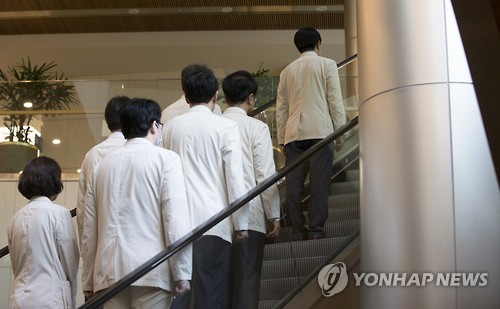 | △ 기자회견장 나서는 의료진 (서울=연합뉴스) 윤동진 기자 = 14일 오전 서울 강남구 서울삼성병원 암병원에서 열린 기자회견에서 송재훈 삼성서울병원 병원장 등 의료진이 중동호흡기증후군(메르스)과 관련된 병원 방침을 말한 후 기자회견장을 나서고 있다. |