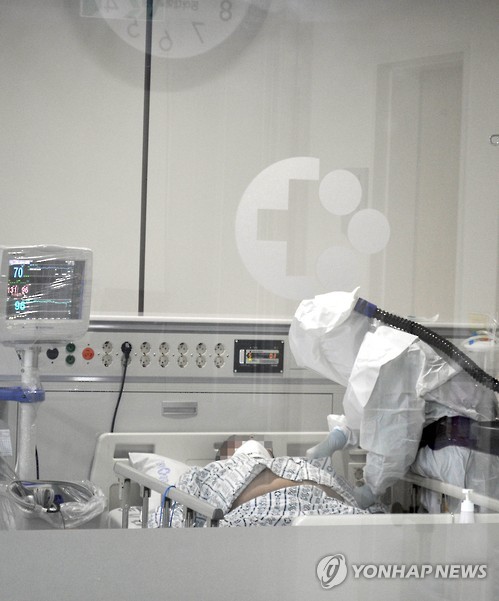 | △ 부산 두번째 메르스 확진자 치료 (부산=연합뉴스) 중동호흡기증후군(메르스)에 감염된 부산의 두 번째 환자 이모(31)씨에 대해 질병관리본부가 최종 확진 판정을 내렸다. 최첨단 음압시설을 갖춘 동아대병원 격리병실에서 의료진이 143번째 감염자인 이씨를 치료하고 있다. 2015.6.14 << 동아대병원 제공 >> ccho@yna.co.kr |