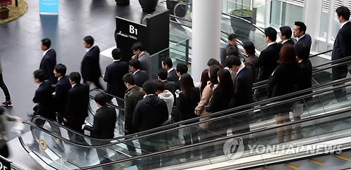 | △ 서울 시내 한 빌딩에서 직장인들이 이야기를 나누며 점심식사를 위해 외출하고 있다. (연합뉴스 자료사진) |